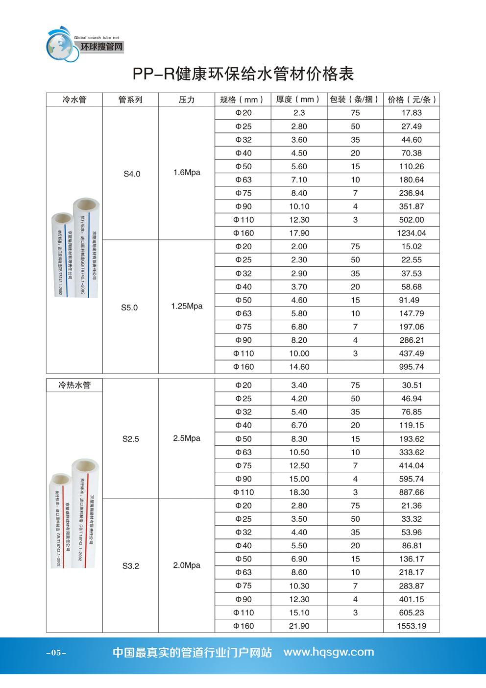 管徑 PPR管的管徑可以從16mm到160mm,家裝中用到的主要是20mm,25mm兩種(分別俗稱4分管、6分管),其中4分管用到的更多些。如果經濟允許,我們更建議用外徑為25毫米的管(俗稱6分管),尤其是進水的冷水管,因為現代家庭居住高度集中、用水器越來越多,同時用水的機率很高,這樣會盡可能減小水壓低、水流量小的困擾。
