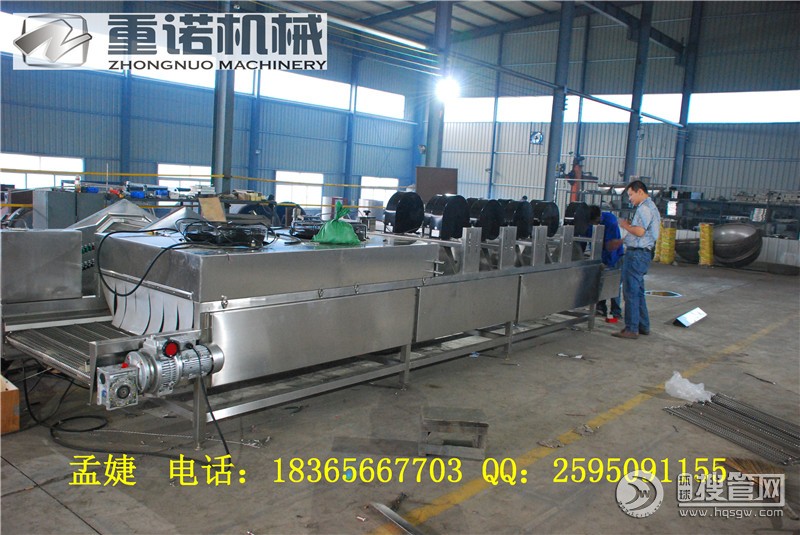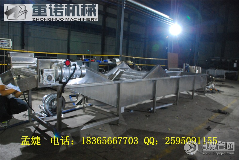 翻轉風干線,洗袋風干機,果蔬清洗風干線將果蔬投入到連續式鼓泡噴淋蔬菜清洗機中,對果蔬進行初清洗,對果蔬進行翻動沖洗,設備中設有氣泡發生裝置,使果蔬呈翻滾狀態,能有效地分離果蔬中的泥沙、毛發纖維、蟲卵及殘留農藥,且果蔬不受損傷。果蔬經網帶傳送至有噴淋管的二次清洗區進行二次清洗,在輸送過程中經過清水的噴淋二次清洗區將產品再清洗一 次沖洗一遍達到干凈的目的,一方面給槽內補充水量,另一方面也能由好的沖洗完果蔬達到最后的漂洗之功能。除去表面農藥 殘留,同時可加入適量的藥劑進行消毒固色。漂浮物可從溢流槽溢出,沉淀物從下面排水孔排出,以達到消毒,清洗的目的。清洗完畢后通過傳動鏈網將蔬菜自動輸送至網帶式翻轉蔬菜風干機,對蔬菜進行翻動風干(吹風為常溫,有效保護蔬菜 保持物料本身的色澤和品質),風干機輸送帶為翻轉式網帶,可對蔬菜進行翻轉式風干,風干機風量變頻器調節,變頻器功率 為4kw。蔬菜風干完后通過風干機的傳動鏈網自動輸送至工作臺上用雙室真空包裝機進行真空包裝。 第五步:真空包裝完畢后包裝好的果蔬放到自動輸送機上,自動輸送至包裝箱內。 我公司主要生產風干機,常溫風干機,熱風風干機、翻轉式風干機、平帶式風干機。主要用于蔬菜、軟包裝等的除水,減少晾曬時間,提高工作效率。