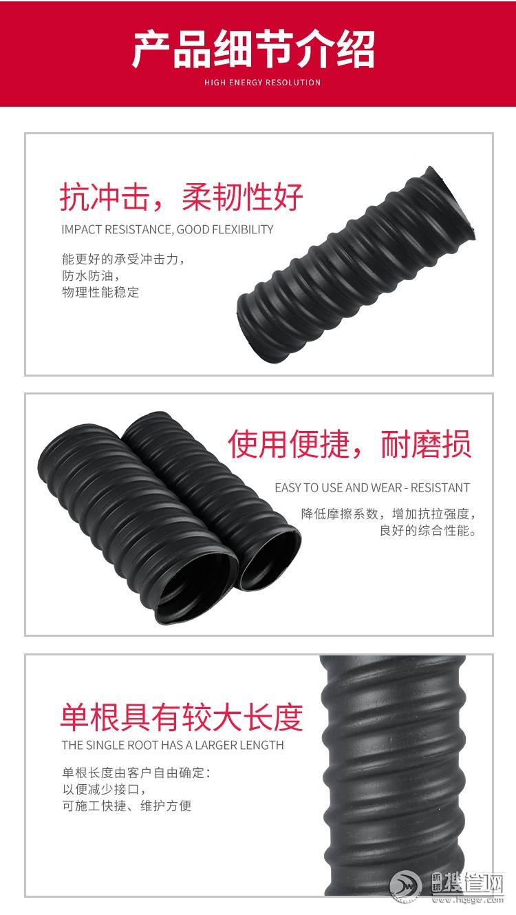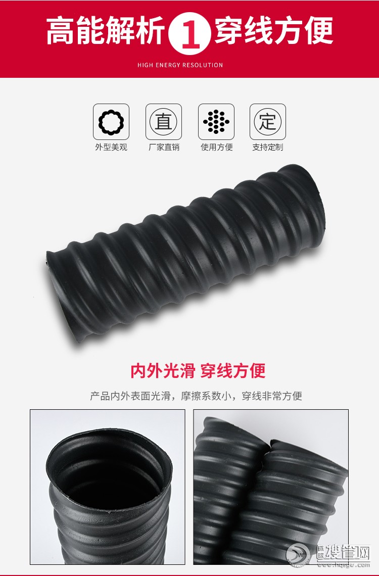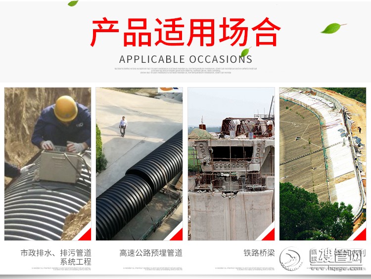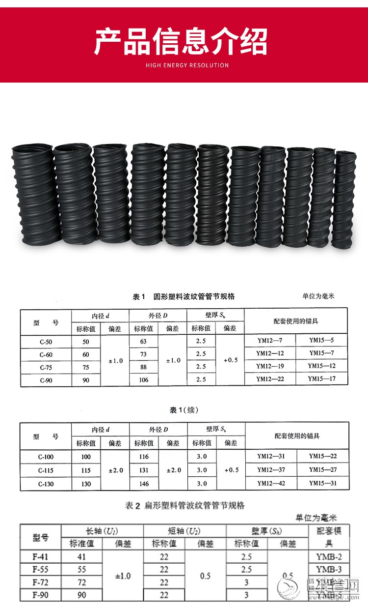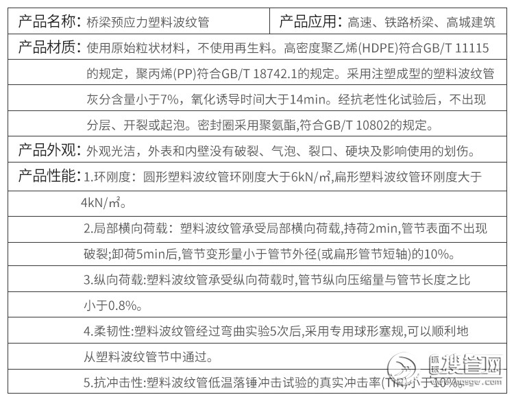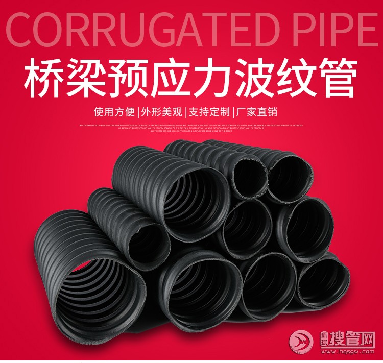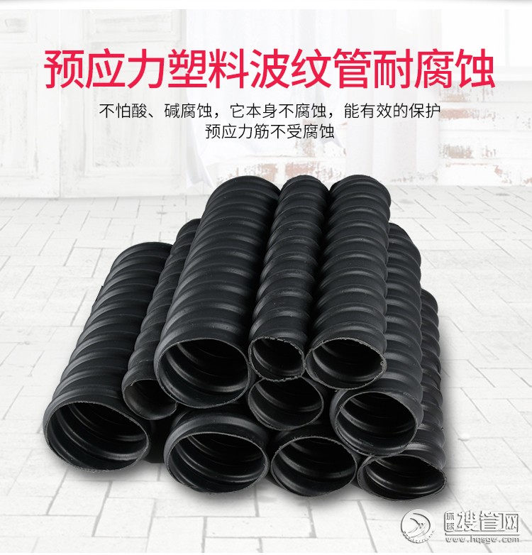 預應力塑料波紋管是以HDPE為生產原材料,主要應用于后張預應力水泥結構,拉桿的成孔,擁有密封性好、無滲水漏漿、環剛度高、摩擦參數小、耐老化、抗電侵蝕、柔彈力好、不易被搗棒鑿破和新式的聯接方式使施工聯接更方便的長處,主要應用于公路,鐵路,橋梁,斜坡,高層建筑等大跨度張拉工程建設中。