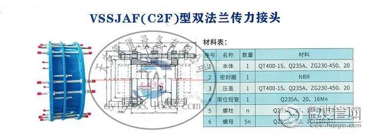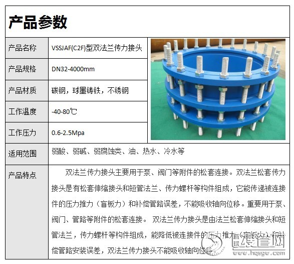 VSSJAF(C2F)型雙法蘭傳力接頭適用于輸送海水、淡水、冷熱水、飲用水、生活污水、原油、燃油、潤滑油、成品油、空氣、煤氣、溫度不高于250度的蒸汽和顆粒粉狀等介質。