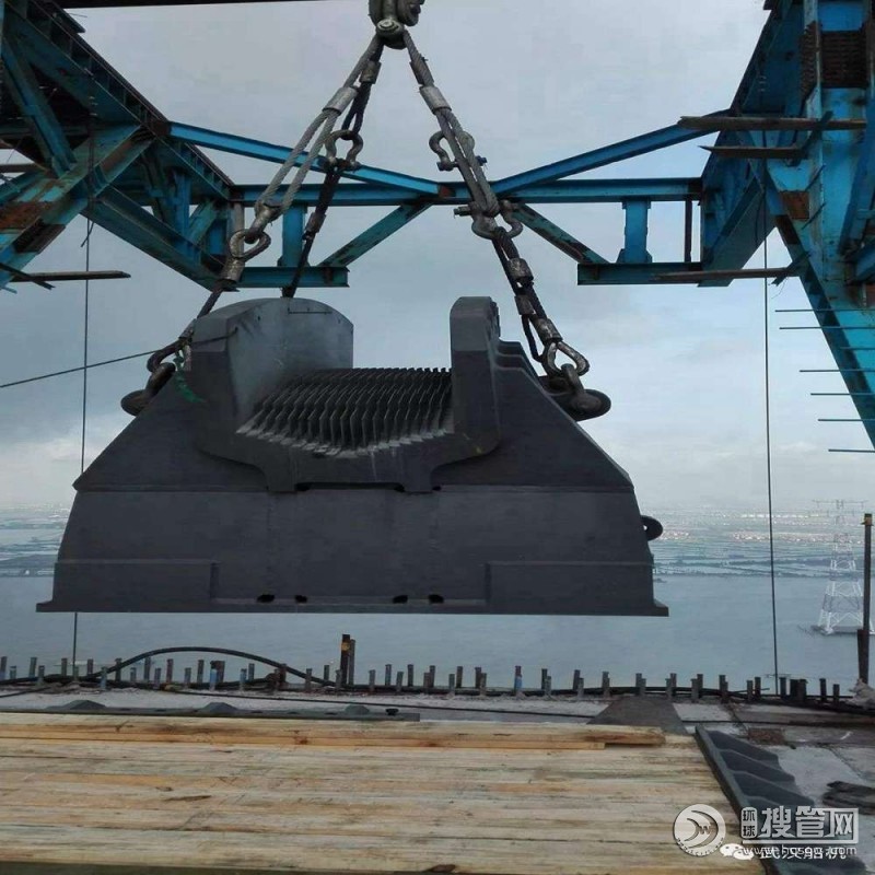 索鞍是支承主纜的重要構件,其作用是保證主纜索平順轉折;將主纜索中的拉力在索鞍處分解為垂直力和不平衡水平力,并均勻地傳至塔頂或錨碇的支架處。索鞍可分為塔頂索鞍和錨固索鞍。塔頂索鞍設置在橋塔頂部,將主纜索荷載傳至塔上;錨固索鞍(亦稱散索鞍),設置在錨碇的支架處,主要作用是改變主纜索的方向,把主纜索的鋼絲繩束在水平及豎直方向分散開來,并將其引入各自的錨固位置。為了減少塔頂索鞍處鋼絲的彎曲次應力,塔頂索鞍彎曲半徑一般為主纜索直徑的8—12倍;而散索鞍必須考慮鋼絲繩束的水平曲率半徑和豎直曲率半徑,以確定索鞍合理形狀。索鞍通常采用鑄焊組合件組成,大型組件采用分塊制作,安裝后通過螺栓或焊接連成整體。
