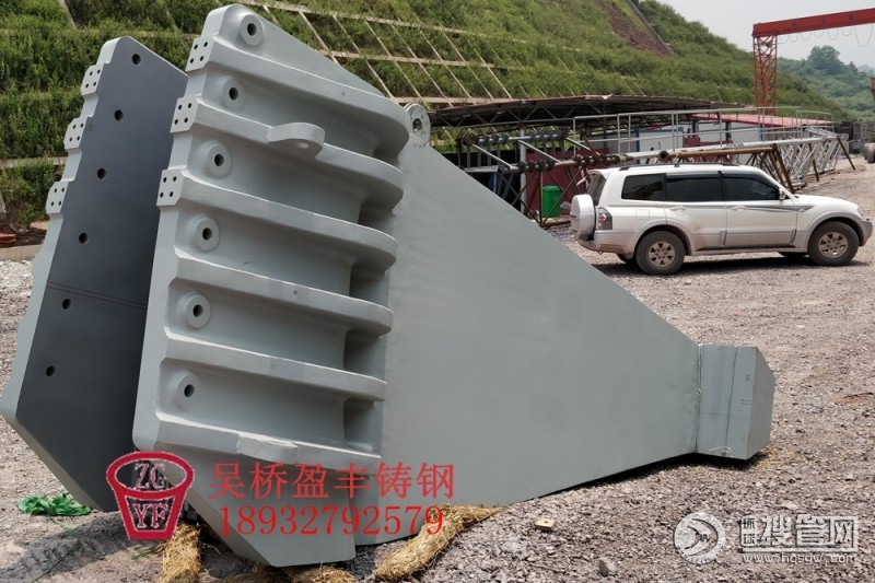 散索鞍多為鑄鋼件,主要由座板、盆式橡膠支座、鞍體三部分組成,為便于鑄造、運輸安裝,將鞍體分成幾段加工,組裝成整體。散索鞍形狀復雜,鞍體主要有兩個功能(即兩部分組成),一是將主纜索股六邊形整形為矩形,壓緊在鞍槽內;二是將主纜索殷順鞍內弧形槽散開。
